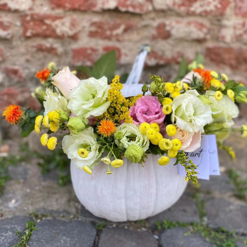 O compoziție florală jucăușă aranjată cu grijă într-un dovleac natural căruia i-am oferit culoarea gri. Aranjamentul emană energie pozitivă, și cu siguranță va colora până și cele mai înnorate zile. Aranajmentul este potrivit pentru persoanele artistice și entuziaste, indiferent de ocazie.